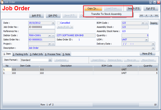 - After complete Job Order, click"Copy To…. Transfer To Stock Assembly"
