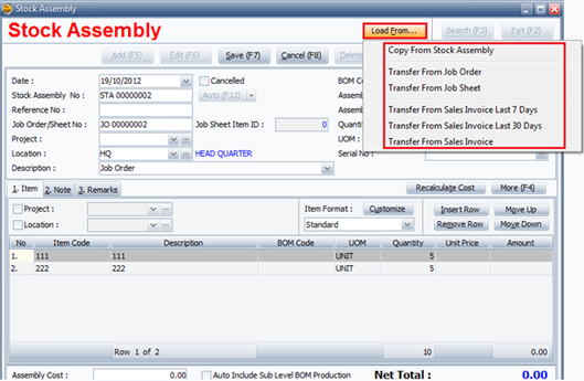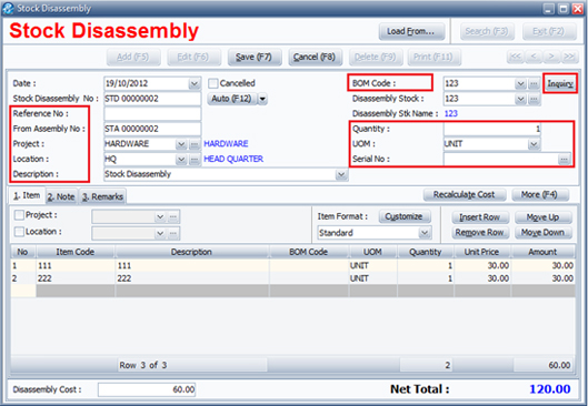 - From Assembly No : Key in Assembly doc no. which doc or BOM code you want to disassembly.
