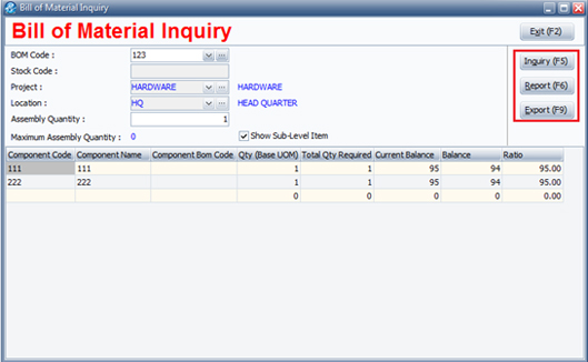 Click BOM Inquiryto check available stock quantity